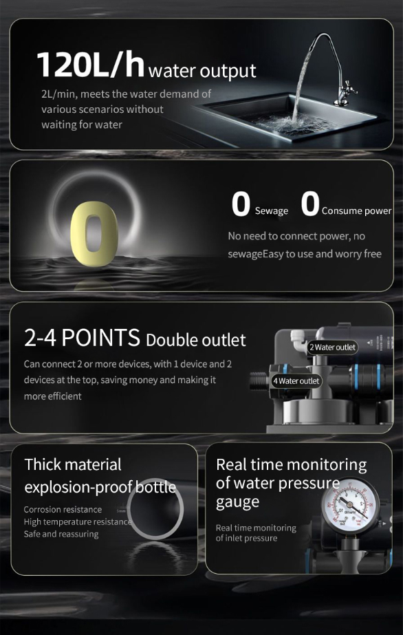 Highlights at a glance: 4-Stage Ultra Filtration: Removes impurities for pure drinking water. 800 GPD Capacity: Produces 800 gallons daily for household use. Self-Cleaning Feature: Easy maintenance with automatic cleaning function. Stainless Steel Construction: Durable and resistant to corrosion. High-Quality Materials: Ensures reliable performance and long lifespan.